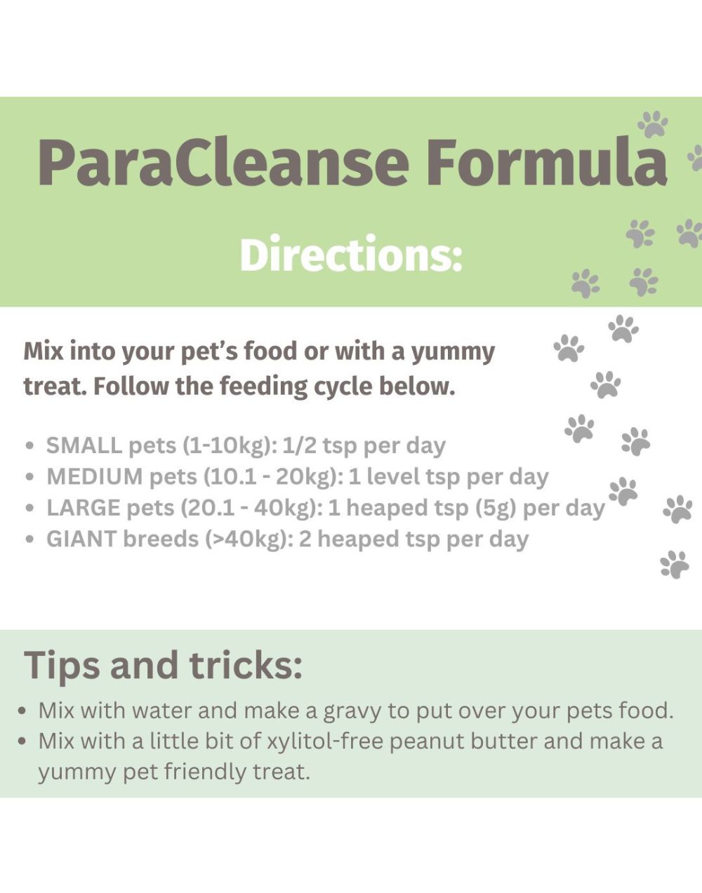 - Large pets [ 20-40kg ]: 1 1/2 tsp (7.5g) per day*